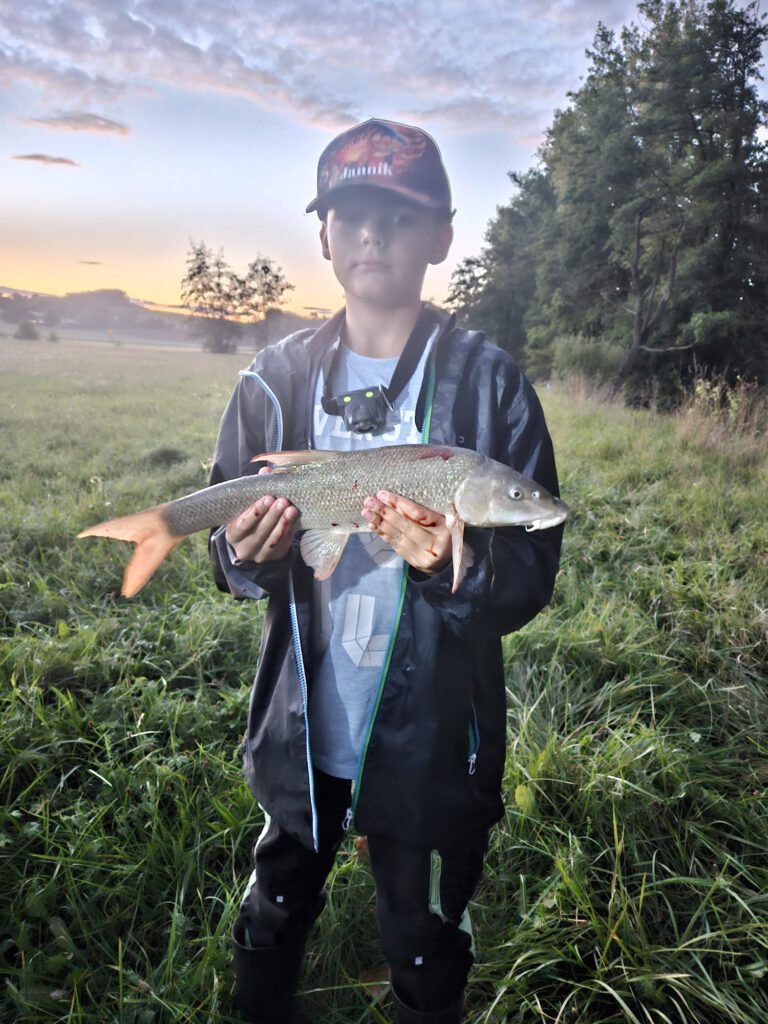 Nach kurzer Einweisung durch Sebastian, dem Jugendleiter des AV Großheirat, ging es auch schon los. Die Jugendlichen versuchten auf verschiedenen Wegen, einen Schuppenträger zum Landgang zu überlisten. Zu Beginn versuchten die Jugendlichen ihr Glück auf Forelle. Dazu nutzten sie entweder einen Spinner, um einen kleinen Beutefisch zu simulieren, oder einen Schwimmer mit Wurm. Es dauerte nicht lange, da wurden auch einige Jugendliche mit schönen Forellen bis 36cm belohnt. Zu Beginn der Dunkelheit änderte sich auch die Strategie und es wurden Würmer auf Grund angeboten, um Aale, Barben oder Karpfen zu überlisten. Hier wurde anschließend auch noch ein stattlicher Karpfen von 1.500g überlistet.